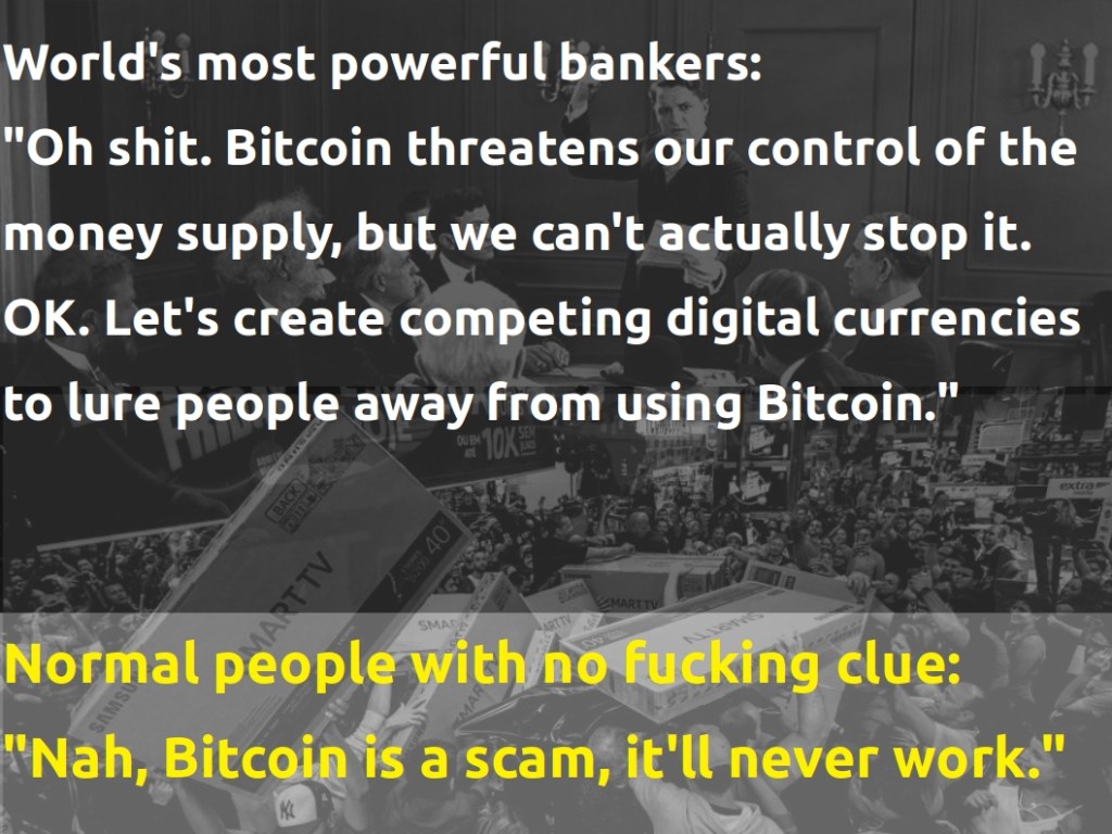 I believe it’s a futile attempt and, by virtue of it being a last ditch effort, it is in fact a confirmation (by the world’s most powerful bankers no less) of the inevitability of the coming Bitcoin disruption.
