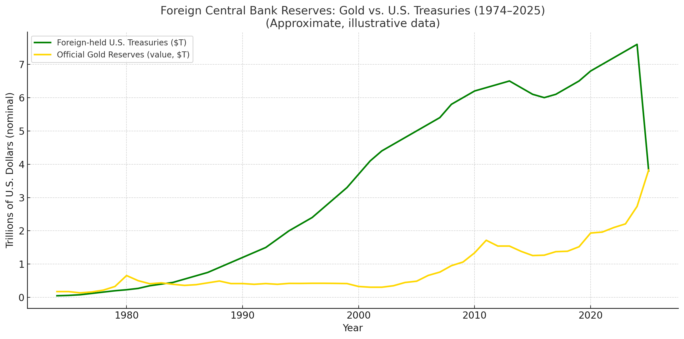Today, the world’s financial system is changing again. Foreign central bank holdings of U.S. Treasuries (U.S. government debt) have fallen from their peak of $7.6 trillion in 2021–22 to about $3.8 trillion in 2025 — almost half. At the same time, foreign central banks have added several thousand tonnes to their gold reserves. Combined with the surge in gold’s price, this means that, for the first time in decades, foreign central banks now own more gold than U.S. government debt.